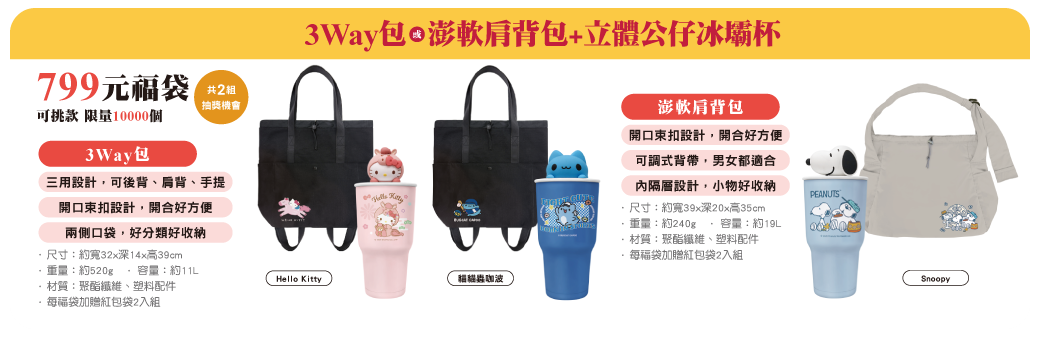 799元福袋共3款,限量共10,000個(含外送平台+現貨+備品;數量有限,售完為止。)