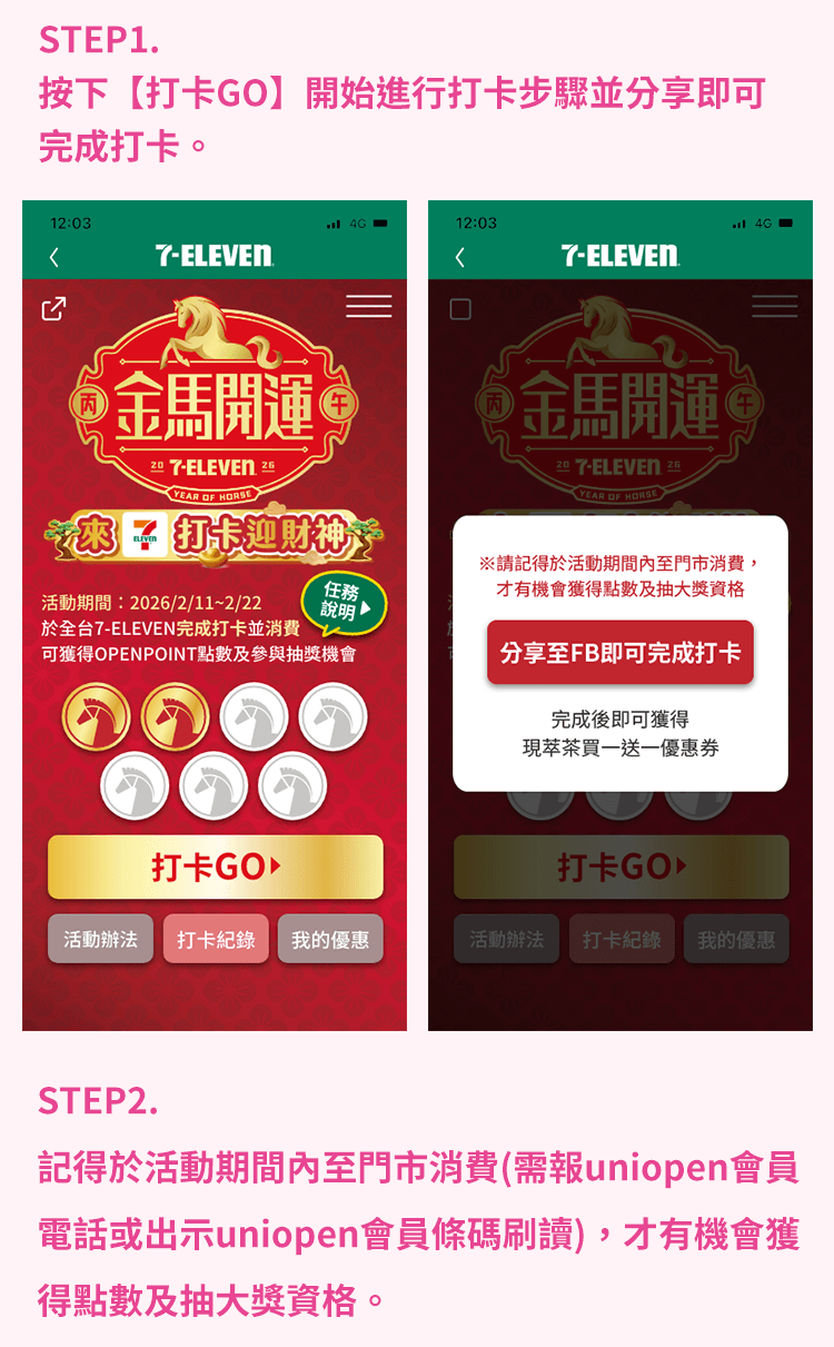 - 會員於 7-ELEVEN APP 完成打卡時所使用之uniopen會員帳號,需與任務2消費紀錄所歸屬之帳號相同。若資料不符,視同未完成任務。